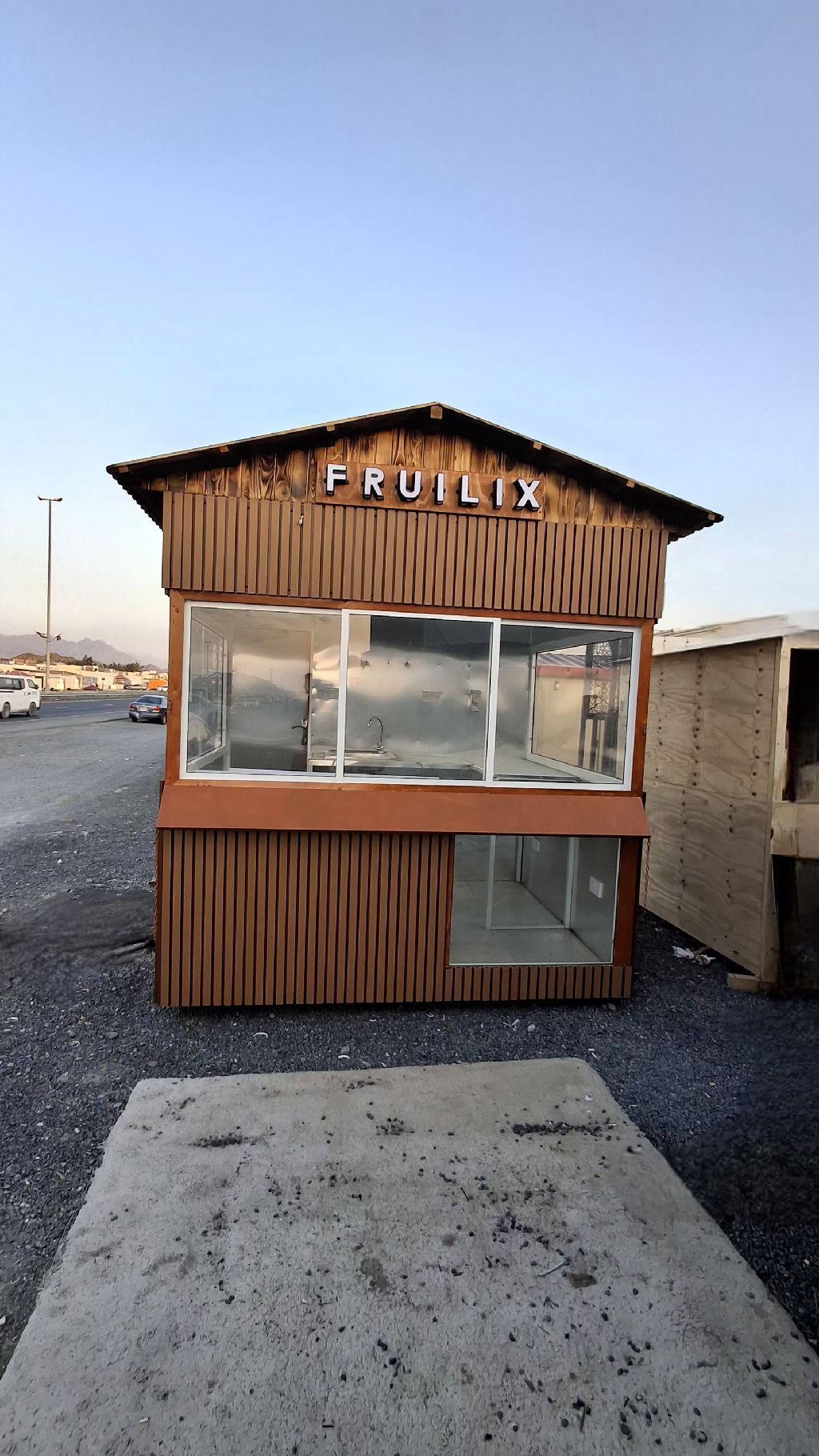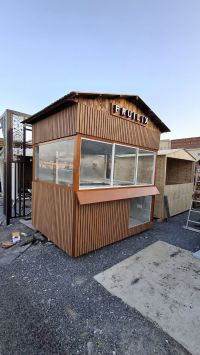 Ready made kiosk for sale - juice/ coffee business - unique design A luxurious wooden kiosk with a modern and attractive design, suitable for juices, cocktails, coffee, crepes, or snacks. Full glass fronts Built - in sink Pre - wired electrical wiring Ample space for comfortable work Easy to transport and assemble Ideal for gardens, beaches, events, farms, and outdoor locations Con