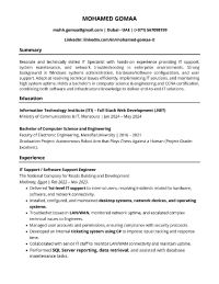 مهندس دعم فني IT بخبرة أكثر من سنتين في دعم المستخدمين، صيانة الأنظمة، واستكشاف أعطال الشبكات وتركيب الكاميرات في بيئات عمل مؤسسية. المهارات والخبرات دعم فني (Hardware & Software) Windows 10/ 11 وWindows Server - Networking (TCP/ IP, DNS, DHCP, VLANs) Active Directory وRemote Desktop - Troubleshooting اجهزة الكمبيوتر والطابعات - SQL Server (تقارير - صيانة أساسية) CCNA Certified