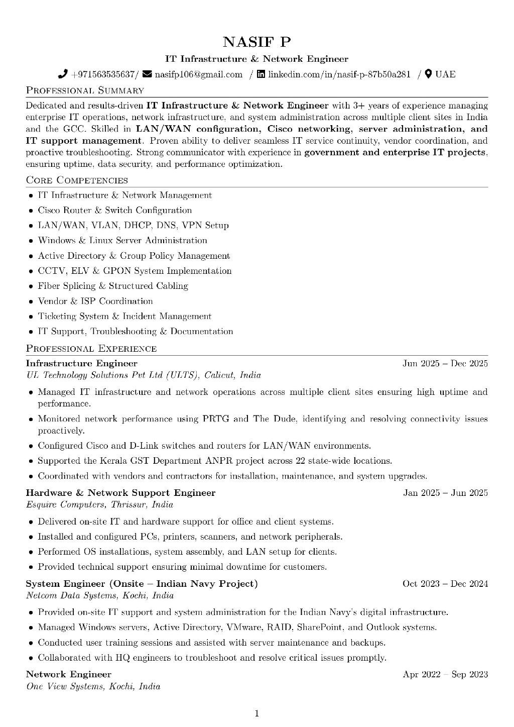 ابحث عن وظيفة مهندس دعم تقنية المعلومات / الشبكات. لدي خبرة 4 سنوات في دعم تقنية المعلومات، الشبكات، وإدارة الأنظمة، مع مهارات قوية في استكشاف الأخطاء وإصلاحها، أنظمة Windows وLinux، Active Directory، وشبكات Cisco. أقيم حاليا في دولة الامارات العربية المتحدة ومتوفر للانضمام فورا