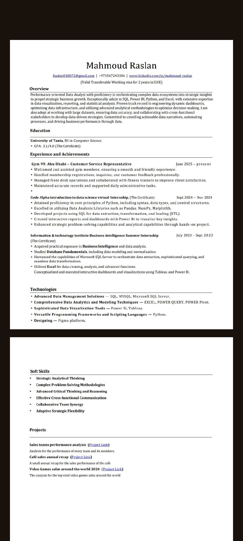 Data Analyst proficient in Power BI, SQL, Excel, and Python libraries (Pandas, NumPy, Matplotlib) Experienced in data collection, cleaning, analysis, and visualization, with expertise in creating interactive dashboards and insightful reports. Seeking to leverage my analytical and technical skills to drive data - driven decisions and contribute to business success