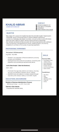 I am a motivated professional with a Bachelor’s in Business Administration and a Diploma in Data Analytics. With one year of experience, I specialize in using Excel, SQL, Python, and Power BI to analyze and visualize data. I combine business knowledge with analytical skills to turn data into actionable insights, supporting smarter decisions and driving business growth