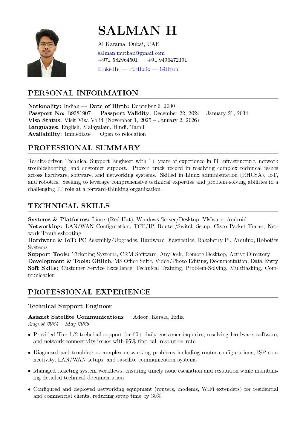 IT support professional with Diploma in Computer Engineering. Experience in broadband troubleshooting, customer support, computer hardware, PC assembling, OS installation, and configuration of routers, modems, and WiFi - extenders. Basic knowledge of CCTV, LAN networking, cybersecurity fundamentals, and Microsoft 365 tools. Seeking IT support/ Help Desk/ IT Operations role