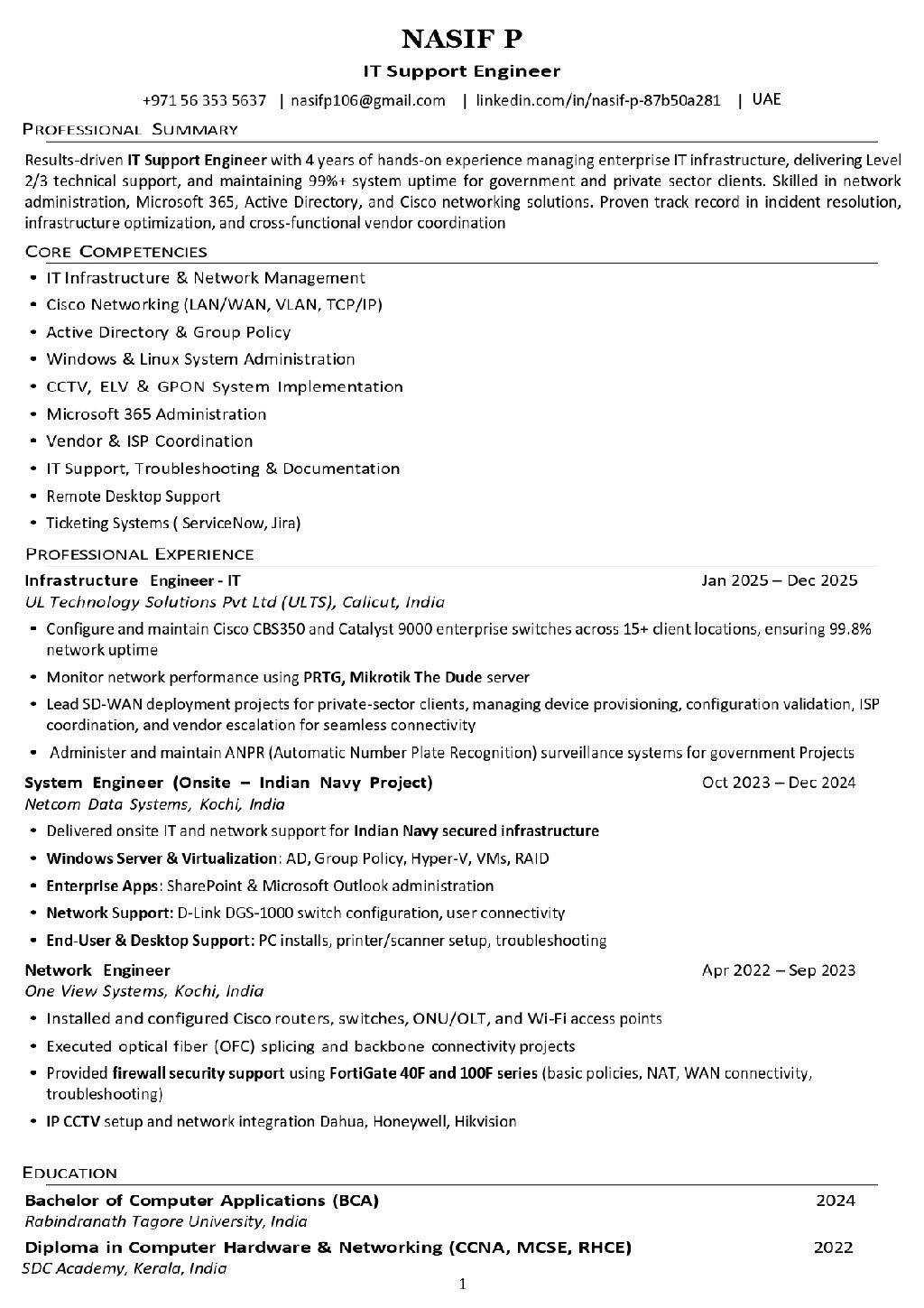 I am Nasif P IT support Engineer with 4 years experience IT support and Networking sector. I have hands on Experience in Core networking, desktop support user ends and CCTV, access control. I hold a Bachelor of Computer Application and Completed in CCNA, MCSE and RHCE Certification course. I am confident to manage secure, stable IT environments and delivering reliable technical support