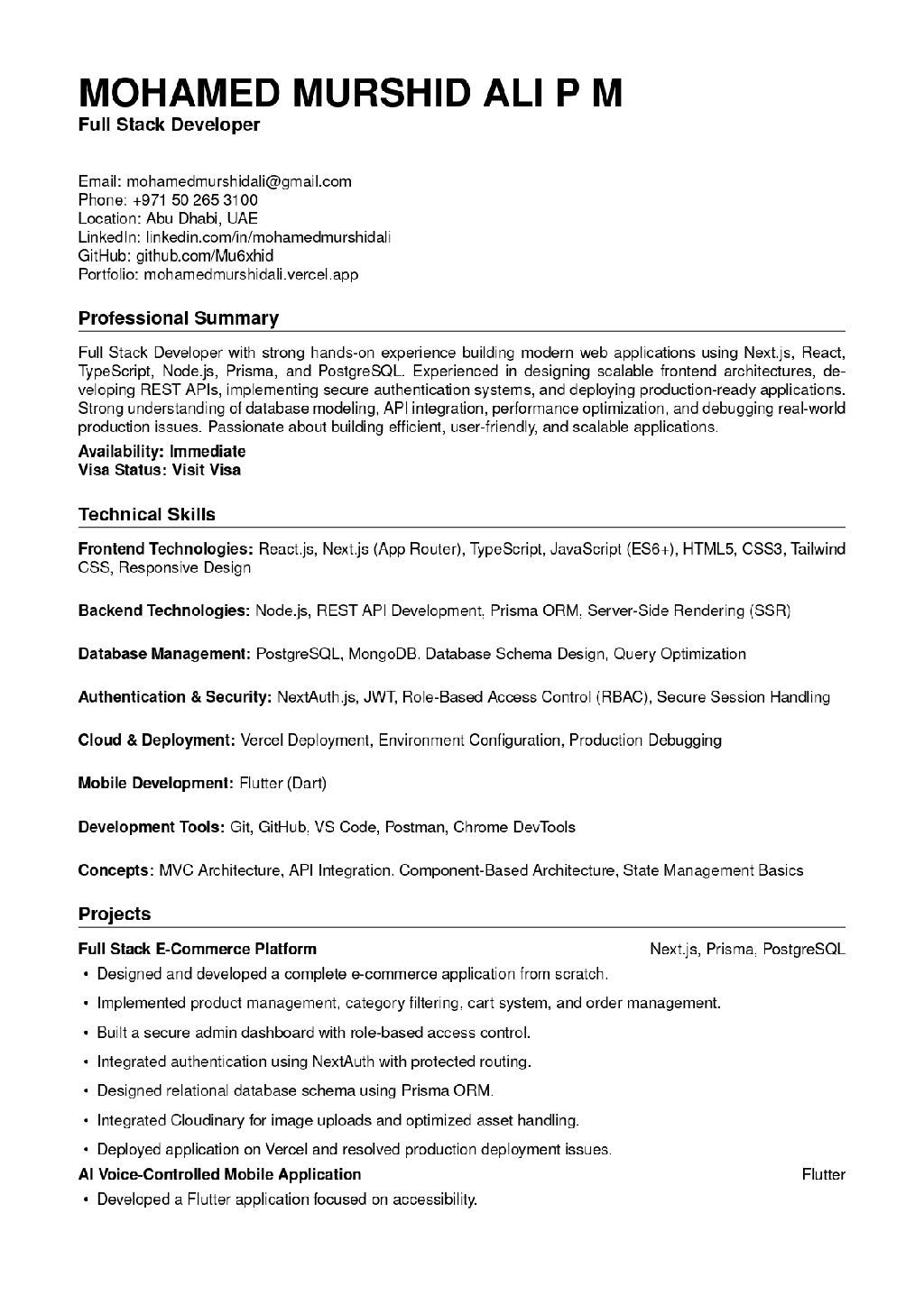 I am Mohamed Murshid Ali, Diploma in Computer Engineering. Skilled in Web Development using HTML, CSS, JavaScript, React. js and Next. js, building responsive websites and web applications. Experience in Flutter mobile app development, basic database and API integration. Also experienced in IT support, Data Entry and MS Office. Ready to work anywhere in UAE and available for immediate joining