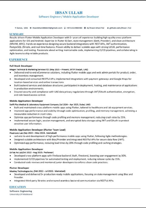 مطور Full Stack ذو خبرة في تطوير تطبيقات الويب والموبايل. ماهر في تقديم حلول سهلة الاستخدام آمنة، وعالية الأداء. لديه خبرة في Flutter وFirebase ودمج APIs وأنظمة الدفع. متاح للعمل كمستقل أو بدوام كامل