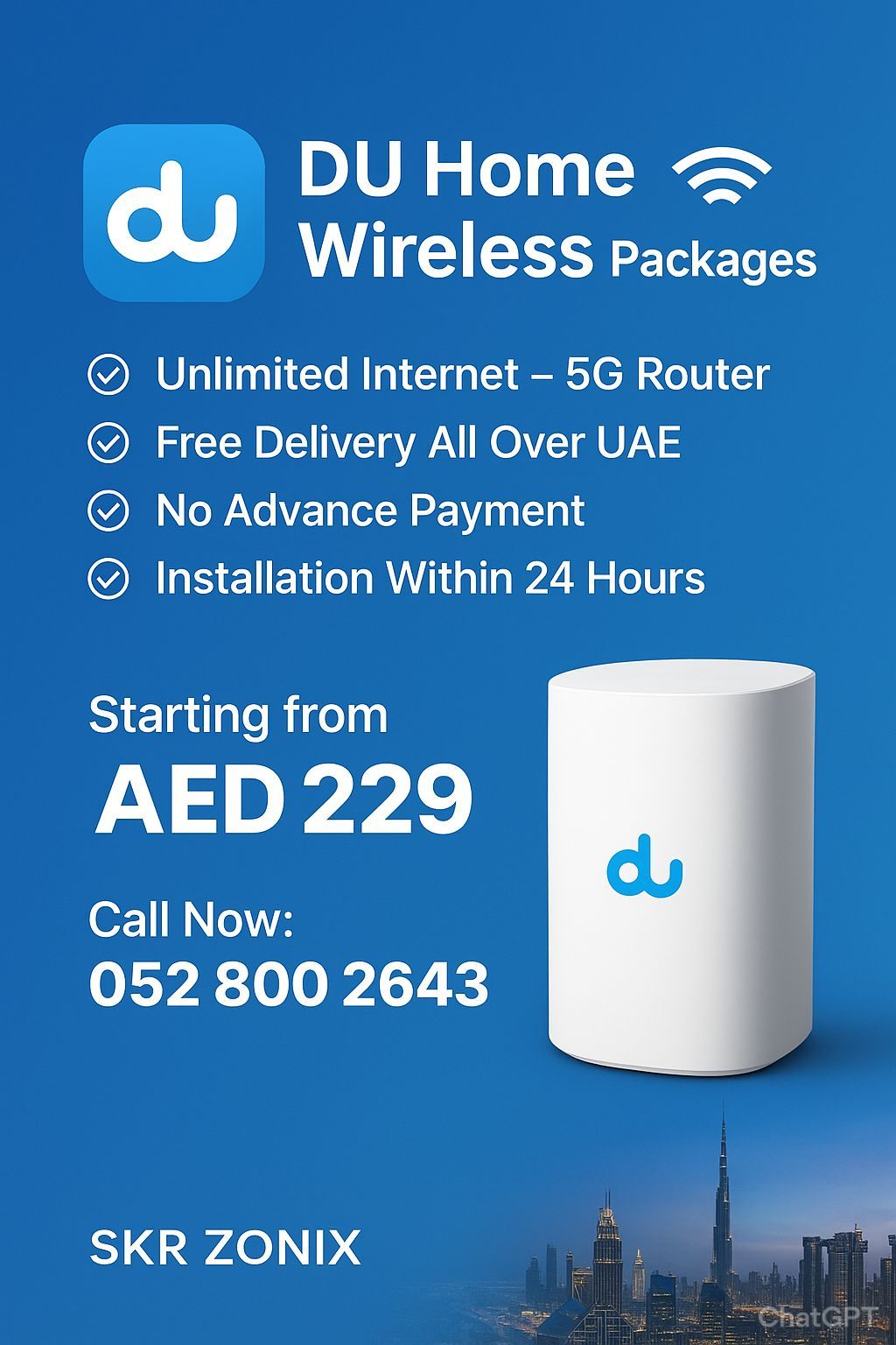 Du Home Wireless internet 5g Router, أصدقائي اذا كنتم بحاجة الى انترنت منزلي سريع وموثوق، بالدينا باقات DU Home Wireless لكم. ابتداء من 229 درهم، مع راوتر 5G، انترنت غير محدود، توصيل وتركيب مجاني - وبدون دفعة مقدمة. ليست مجرد باقة، بل خدمة لراحتكم. أطلب الآن وسنقوم بالتوصيل خلال 24 ساعة