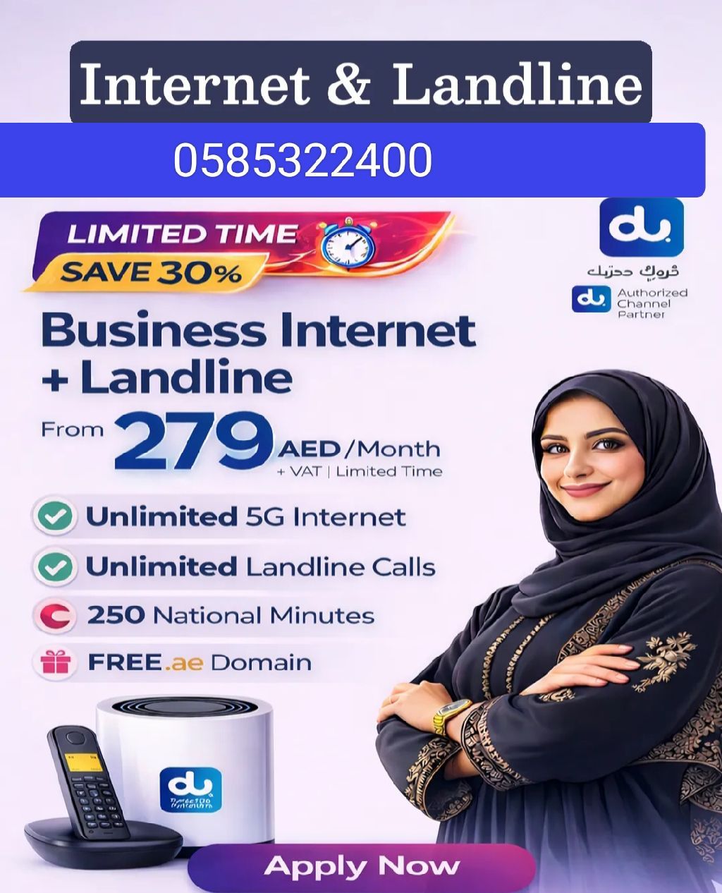 انترنت وخط أرضي من دو للأعمال 279 فقط خصم 30 لمدة 6 أشهر بيانات غير محدودة راوتر 5G مكالمات غير محدودة بين الخطوط الأرضية نطاق مجاني متجر الكتروني مجاني لمدة 12 شهرا للمزيد من التفاصيل دو للأعمال فقط 249 انترنت وبيانات غير محدودة راوتر 5G عقد لمدة 12 شهرا