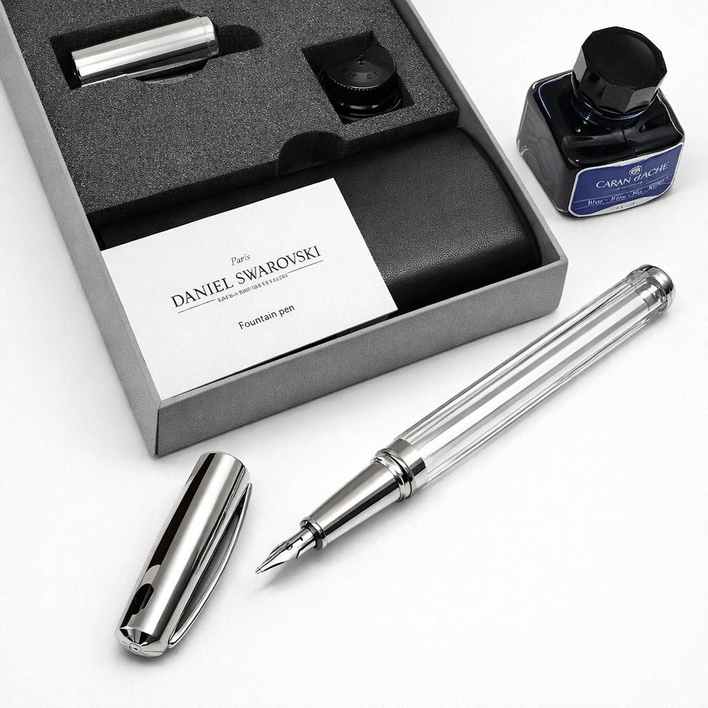 Daniel Swarovski Paris Crystal Fountain Pen - Luxury Edition Elegant crystal fountain pen by Daniel Swarovski Paris, crafted with a faceted crystal barrel and refined silver - tone metal details, combining sophistication with precision craftsmanship. Condition Original condition Includes Original presentation box - Certificate of authenticity - Leather case - Ink bottle A distinguished piece for