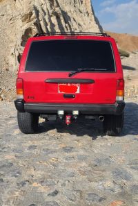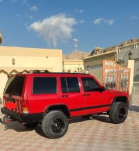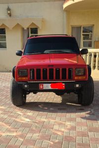 For sale: Jeep Cherokee 1998 model, manual transmission, red exterior, gray interior. The engine has fenders, a lift kit, and 15-inch rims with 10-spoke design. Includes electronic exhaust and programming. Asking price: 15,000 AED, negotiable.
