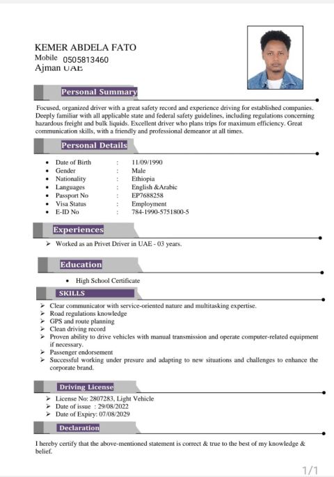 سائق وسائقة من اثيوبيا خبرة ثلاثة سنوات لدينا رخصة قيادة اماراتية وخبرة بطرق العين وأبوظبي نبحث عن عمل مع أسرة أو شركة نجيد اللغة العربية والانجليزية