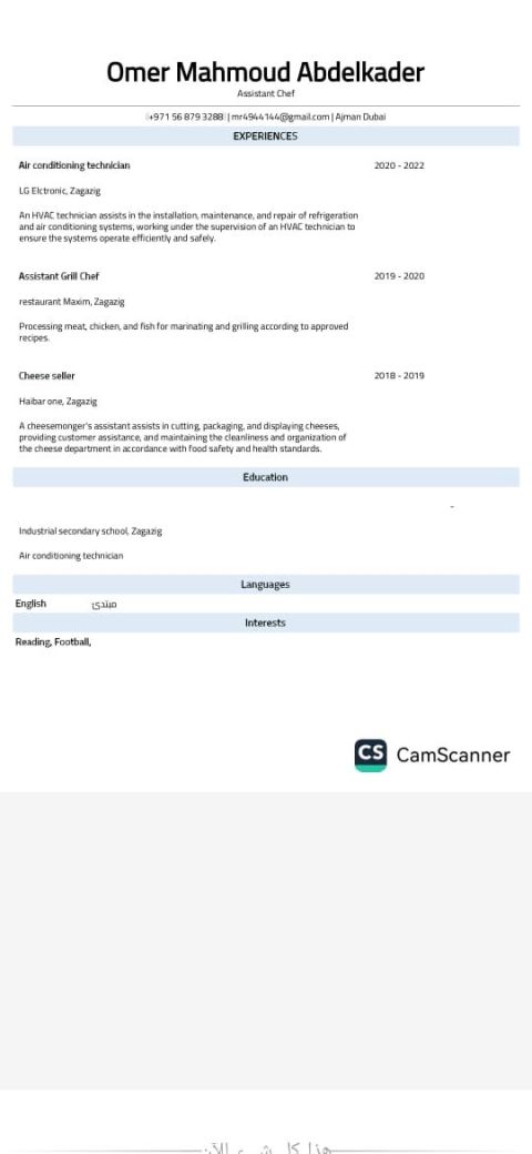 My name is Kabir Ahmad. I am looking for a job in kitchen chef. I has been ten years experience In UAE in the same field. I am experts. Italian food. continental food. American food. Continental and Arabic breakfast. Pastry. All kinds of sauce. All kinds of pizza pasta and salad and rossito. All kinds of burger and sandwiches and sanks. All kinds of hot and cool drinks. All kinds of pastry
