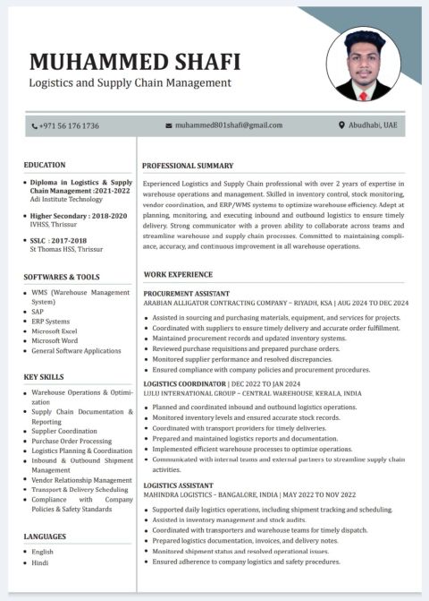 Motivated logistics professional with hands - on experience in warehouse operations, inventory management, procurement support, and dispatch coordination. Skilled in using WMS and SAP to ensure accurate GRN processing, inbound control, and efficient order fulfillment. Strong ability to maintain stock accuracy, improve workflow efficiency, and support daily operational targets