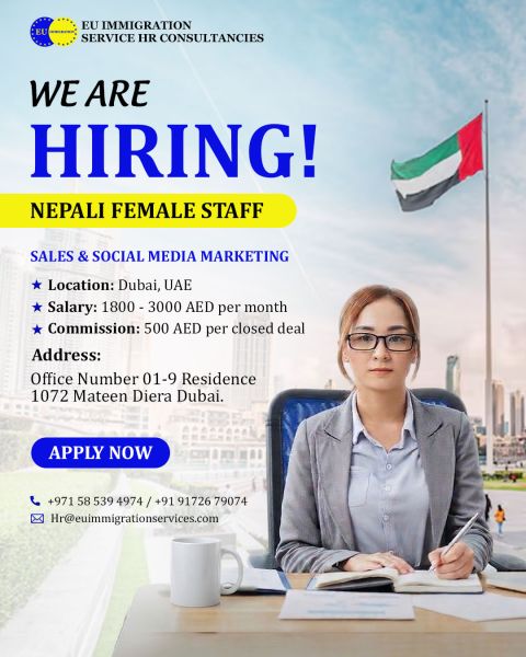 We are Urgently Hiring NPL/ IND Female Staff For Our Office, For Sales and social media Marketing, Salary will be 1800 - AED2500 + Commission it's depends Work we preferred own visa holder, Also Company will provide visa, For More details kindly Dm