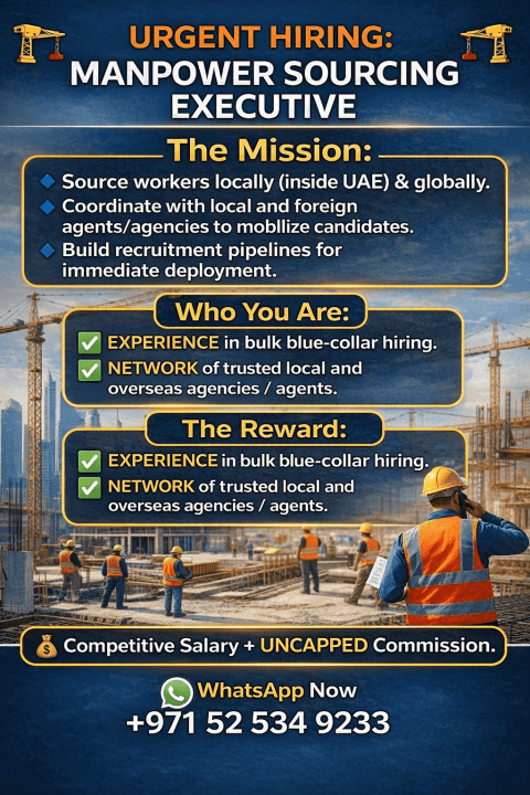 URGENT HIRING MANPOWER SOURCING Executive Do you know how to move numbers We are looking for a results - driven Sourcing Executive to join our recruitment team in the UAE. We need someone who can handle HIGH VOLUME blue - collar recruitment from Day 1. The Mission Source workers locally (inside UAE) Globally. Coordinate with foreign agents to mobilize candidates. Build recruitment pipelines Al Qusais