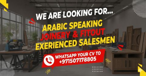 Looking FOR JOINERY, INTERIORS OR FITOUTS Experienced Salesman, WHO SPEAKS English. WhatsApp YOUR CV TO THE WhatsApp Number IN THE AD. WE ARE LOCATED IN ALQUOZ Dubai