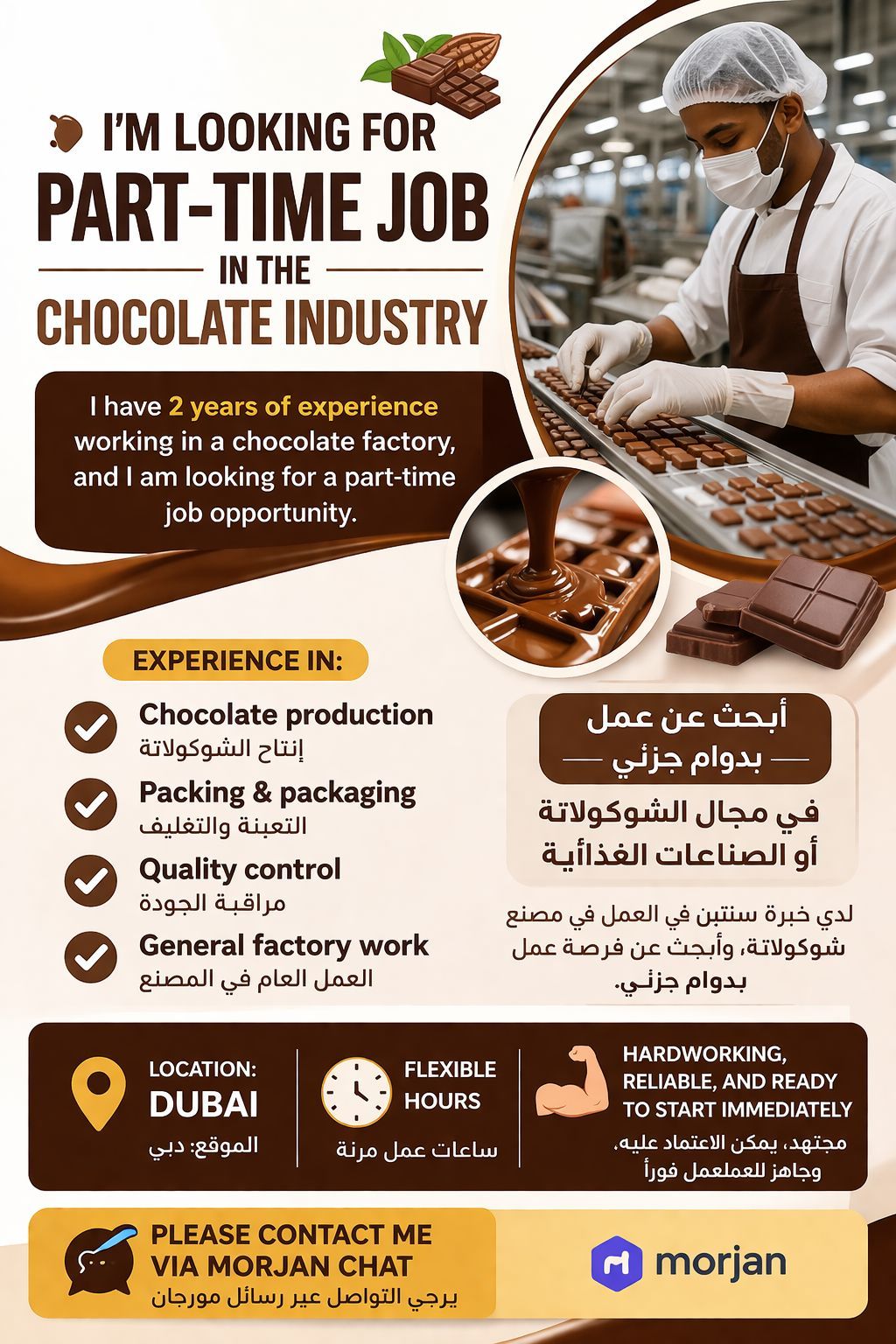 أنا ابحث عن عمل بدوام جزئي في مجال الشوكولاته أو الصناعات الغذائية. لدي خبرة سنتين في العمل في مصنع شوكولاته، وتشمل انتاج الشوكولاته التعبئة والتغليف مراقبة الجودة العمل العام في المصنع الموقع دبي متاح لساعات عمل مرنة مجتهد ويمكن الاعتماد عليه وجاهز للعمل فورا