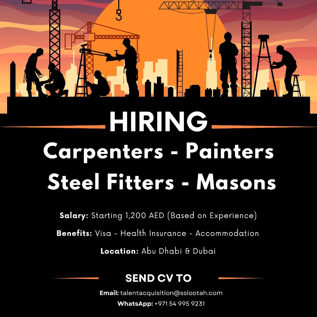 Urgent Hiring - Skilled Workers (Dubai & Abu Dhabi) We are looking for experienced Carpenters, Painters, Steel Fitters, and Masons to join our team in Dubai and Abu Dhabi. Positions Carpenter Painter Steel Fitter Mason Salary Starting from AED1200 (based on experience) Benefits Provided Company Visa Health Insurance Accommodation Transportation Work Location Dubai & Abu Dhabi