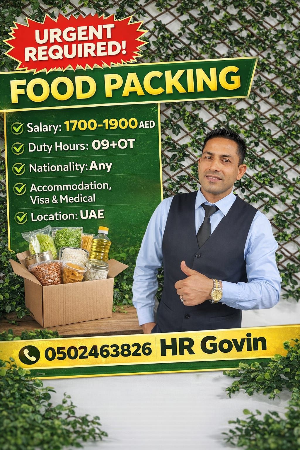 Urgent hiring for food packing starting salary AED1700 - AED1900 + 0T Weekly one off and 9 hour Duty Nationality - any location Dubai (Jebel Ali)