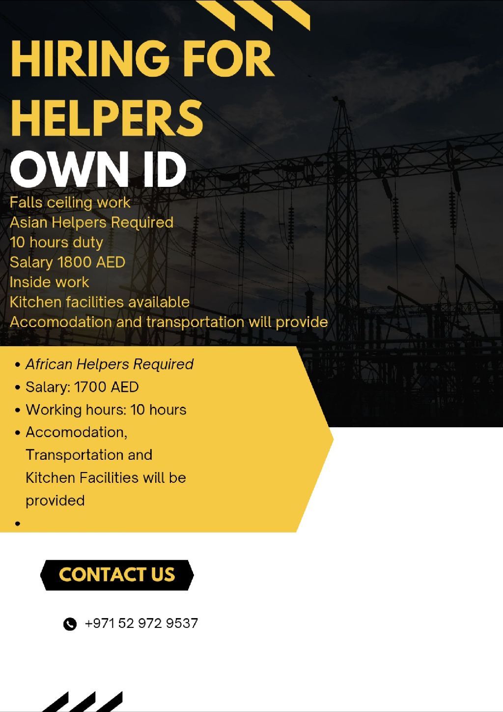 We need plumber helpers and electrician helpers. company will pay monthly 1700 with accommodation and transportation. 10 hours in a day total 26 days work Al Qusais 4 near galadari school
