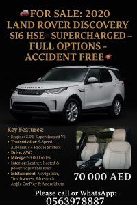للبيع لاند روفر ديسكفري SI6 HSE موديل 2020 - سوبرتشارج - فل اوبشن - بدون حوادث وبدون صبغ 6 سلندر 90 ألف ميل سيارة ممتازة كاملة المواصفات مطلوب 70 ألف درهم