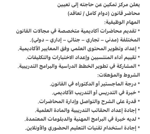 يعلن مركز تمكين عن حاجته الى تعيين محاضر قانون (دوام كامل / تعاقد) في القرهود المهام الوظيفية تقديم محاضرات أكاديمية متخصصة في مجالات القانون المختلفة (مدني - تجاري - جنائي - اداري - دولي) اعداد وتطوير المحتوى العلمي وفق المعايير الأكاديمية. تقييم أداء المنتسبين واعداد الاختبارات والتكليفات. المشاركة في تطوير الخطط الدراسية والبرامج التدريبية
