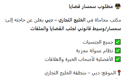 مطلوب سمسار قضايا - مكتب محاماة في الخليج التجاري - دبي - يعلن عن حاجته الى سمسار / وسيط قانوني لجلب القضايا والعملاء - جميع الجنسيات - نظام عمولة مجزية الأفضلية لأصحاب الخبرة والعلاقات الموقع دبي - منطقة الخليج التجاري
