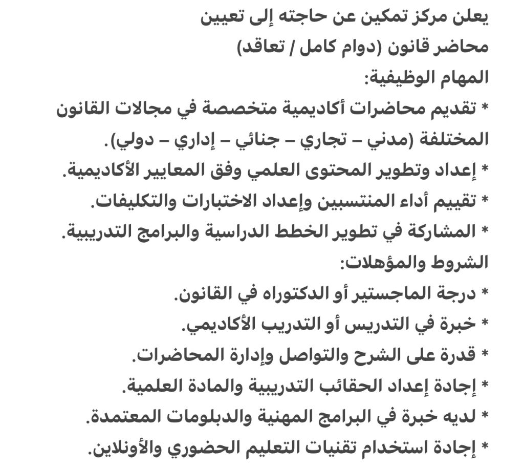 يعلن مركز تمكين عن حاجته الى تعيين محاضر قانون (دوام كامل / تعاقد) في القرهود المهام الوظيفية تقديم محاضرات أكاديمية متخصصة في مجالات القانون المختلفة (مدني - تجاري - جنائي - اداري - دولي) اعداد وتطوير المحتوى العلمي وفق المعايير الأكاديمية. تقييم أداء المنتسبين واعداد الاختبارات والتكليفات. المشاركة في تطوير الخطط الدراسية والبرامج التدريبية