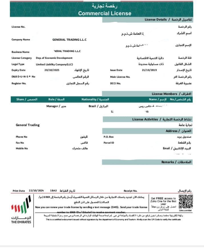 GENERAL TRADING License for sale ISSUE Year IS 2019 WITH BANK ACCOUNT All CLEAR CLEAN License