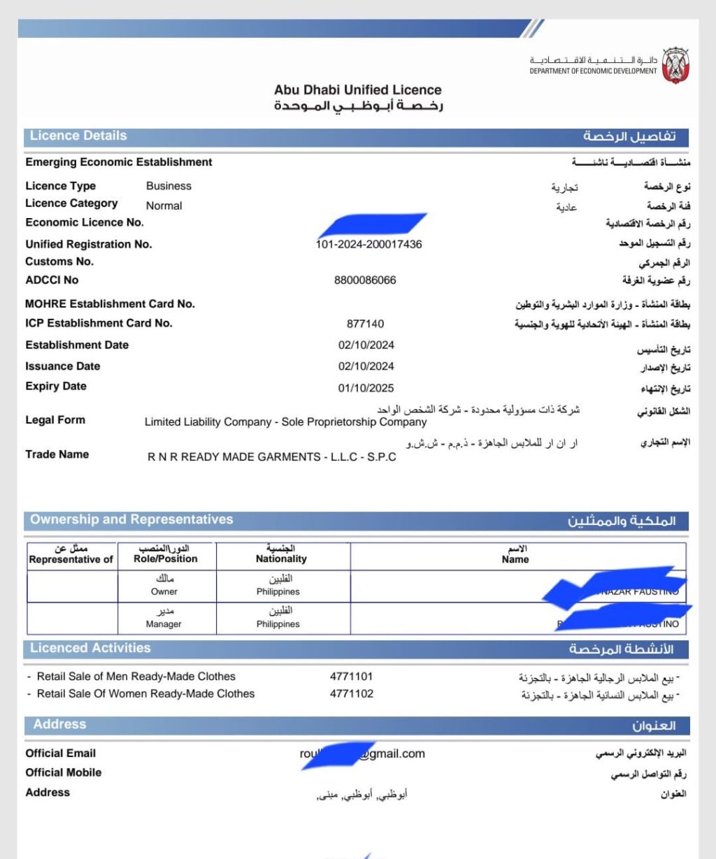 Ready made garments business license for sale in Abu Dhabi, unused and without employees You can change the activity. For serious people, contact WhatsApp on the number provided