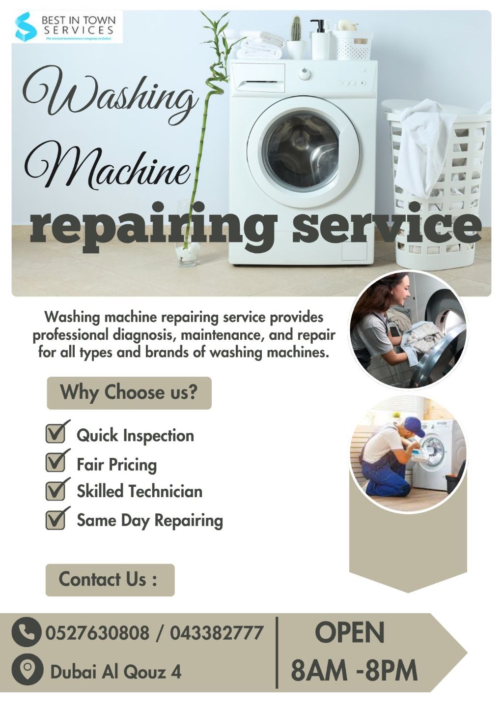 خدمة صيانة غسالات الملابس في دبي هل غسالتك لا تدور، أو تسرب الماء، أو لا تصرفه بشكل صحيح تقدم شركة "بيست إن تاون سيرفيسز" خدمة صيانة غسالات احترافية في دبي، مع حلول سريعة وموثوقة لجميع الماركات والموديلات الرئيسية. يقوم فنيونا المهرة بتشخيص واصلاح مشاكل الغسالات الشائعة، مثل أعطال المحرك، ومشاكل التصريف، وتسرب الماء، والاهتزاز المفرط، والمشاكل الكهربائية، وظهور رموز الأعطال. غالبا ما تحدث هذه المشاكل