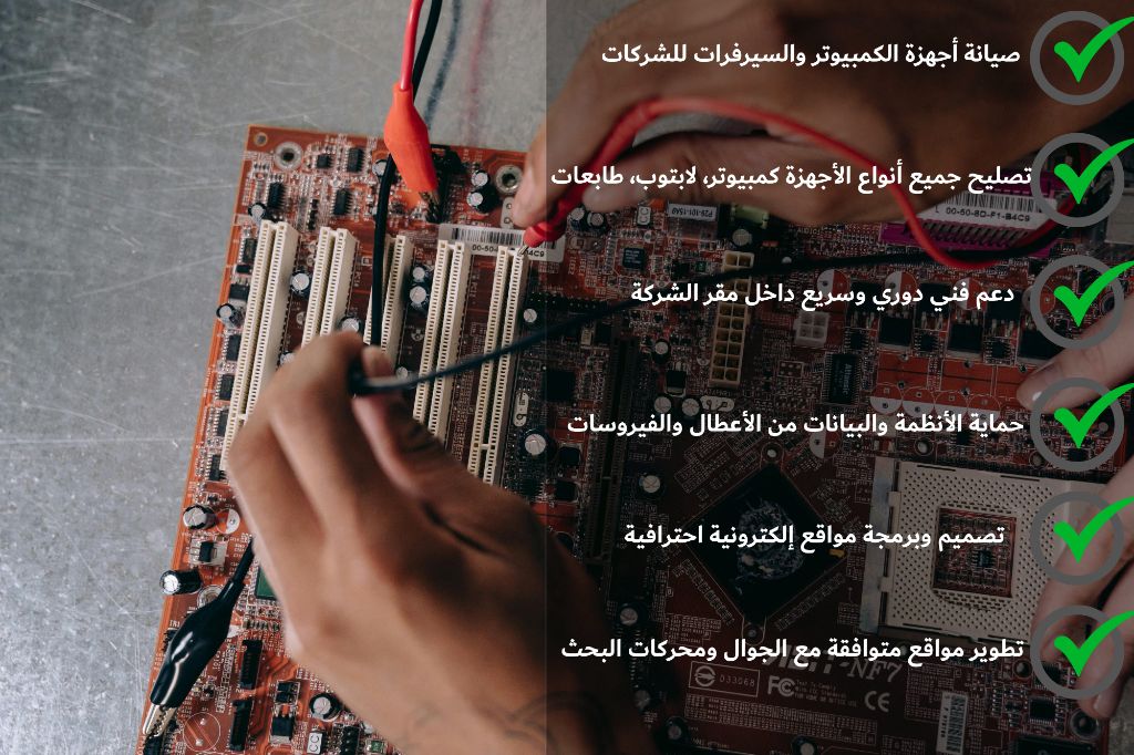 خدمات صيانة شاملة لاجهزة الكمبيوتر والخوادم لحد بيتك أو شركتك + تصميم مواقع احترافية نقدم خدمات صيانة متكاملة لاجهزة الكمبيوتر (PC / Laptop) سواء سوفتوير أو هاردوير للأفراد والشركات، مع ضمان أعلى جودة - ثبات تام - وأداء قوي لأجهزتك. خدماتنا تشمل صيانة اجهزة الكمبيوتر واللابتوب تحديث أنظمة التشغيل والبرامج ازالة الفيروسات والبرمجيات الضارة اصلاح أعطال الهاردوير (Ram - Hard Disk - Power Supply وغيرها)