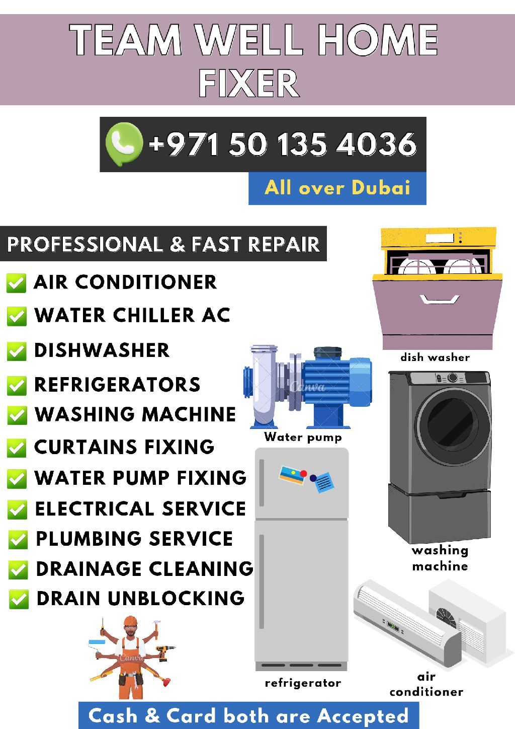 Air Conditioning service, Home Appliances, plumbing services, electrical Service, washing machines dryer repair, drains opening