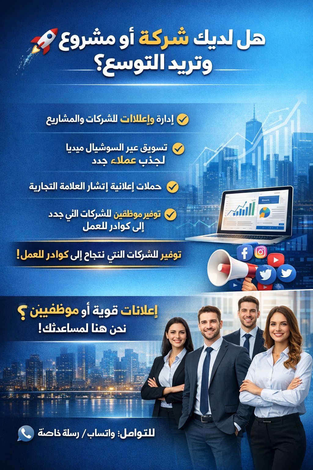 هل لديك شركة أو مشروع وتريد التوسع نحن نساعد الشركات على جذب عملاء جدد وزيادة المبيعات من خلال اعلانات وتسويق احترافي. خدماتنا انشاء وإدارة الاعلانات للشركات والمشاريع تسويق عبر السوشيال ميديا لجذب العملاء حملات اعلانية لزيادة انتشار العلامة التجارية توفير موظفين للشركات التي تحتاج الى كوادر للعمل الرقم موجود للتواصل