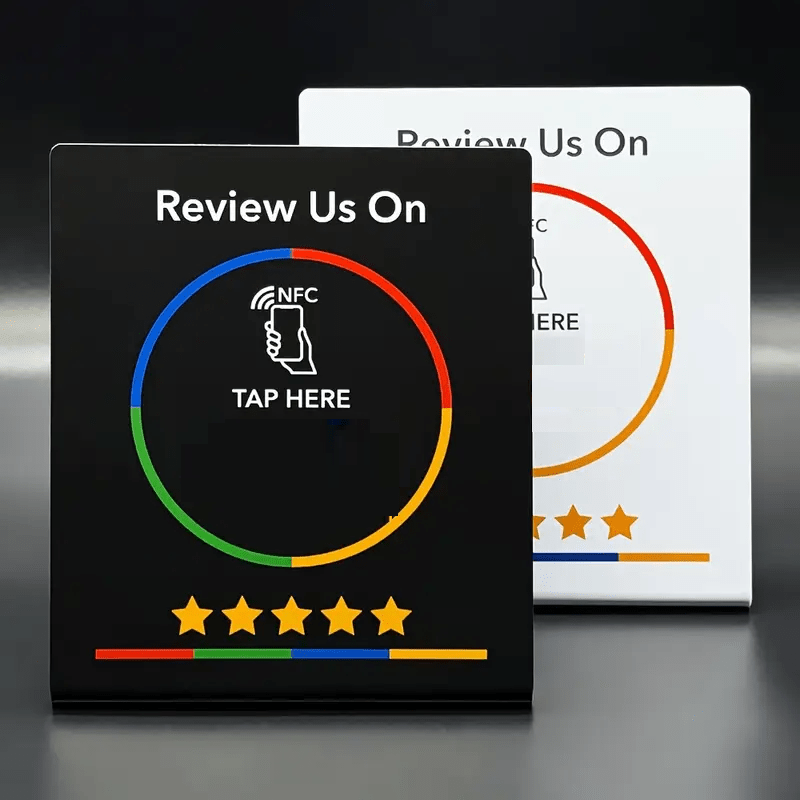 A stand to boost your reviews just tap your phone on the card or scan the QR code, and the review page will pop up. Every new review improves your ranking, builds more trust, and increases your sales
