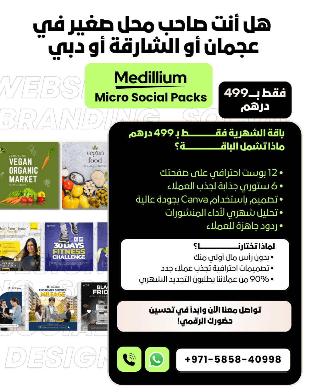 لأصحاب المشاريع الصغيرة في عجمان، الشارقة، ودبي هل سئمت من القلق بشأن محتوى صفحاتك على السوشيال ميديا هل لديك منتج رائع لكن لا تجد الوقت الكافي لتسويقه نحن هنا لنحل هذه المشكلة جذريا الآن، يمكنك الحصول على إدارة محتوى احترافية كاملة لمنصاتك بأقل من تكلفة فنجان قهوة يوميا مقابل 499 درهم شهريا