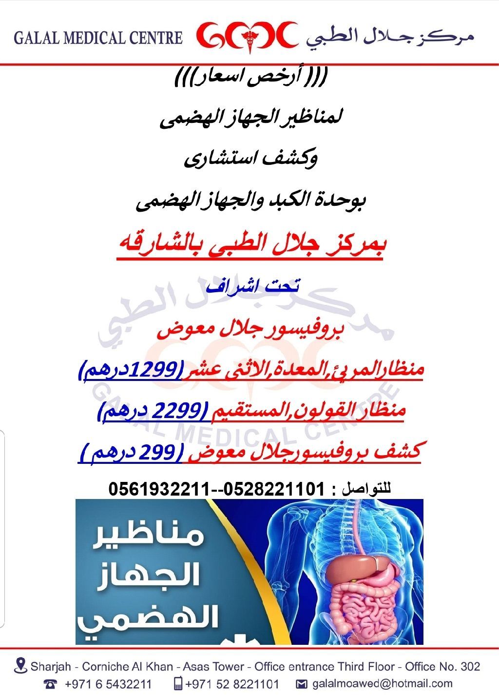 أرخص أسعار) مناظير الجهاز الهضمي في كل الامارات العربية المتحدة ودول مجلس التعاون الخليجي (نقدم أعلى مستوى علمي ومهني) الخدمة المتميزه التي تستحقها بالسعر الذي تتمناه لمناظير الجهاز الهضمي وكشف استشاري بكل الامارات العربية المتحدة (بوحدة الكبد والجهاز الهضمي)