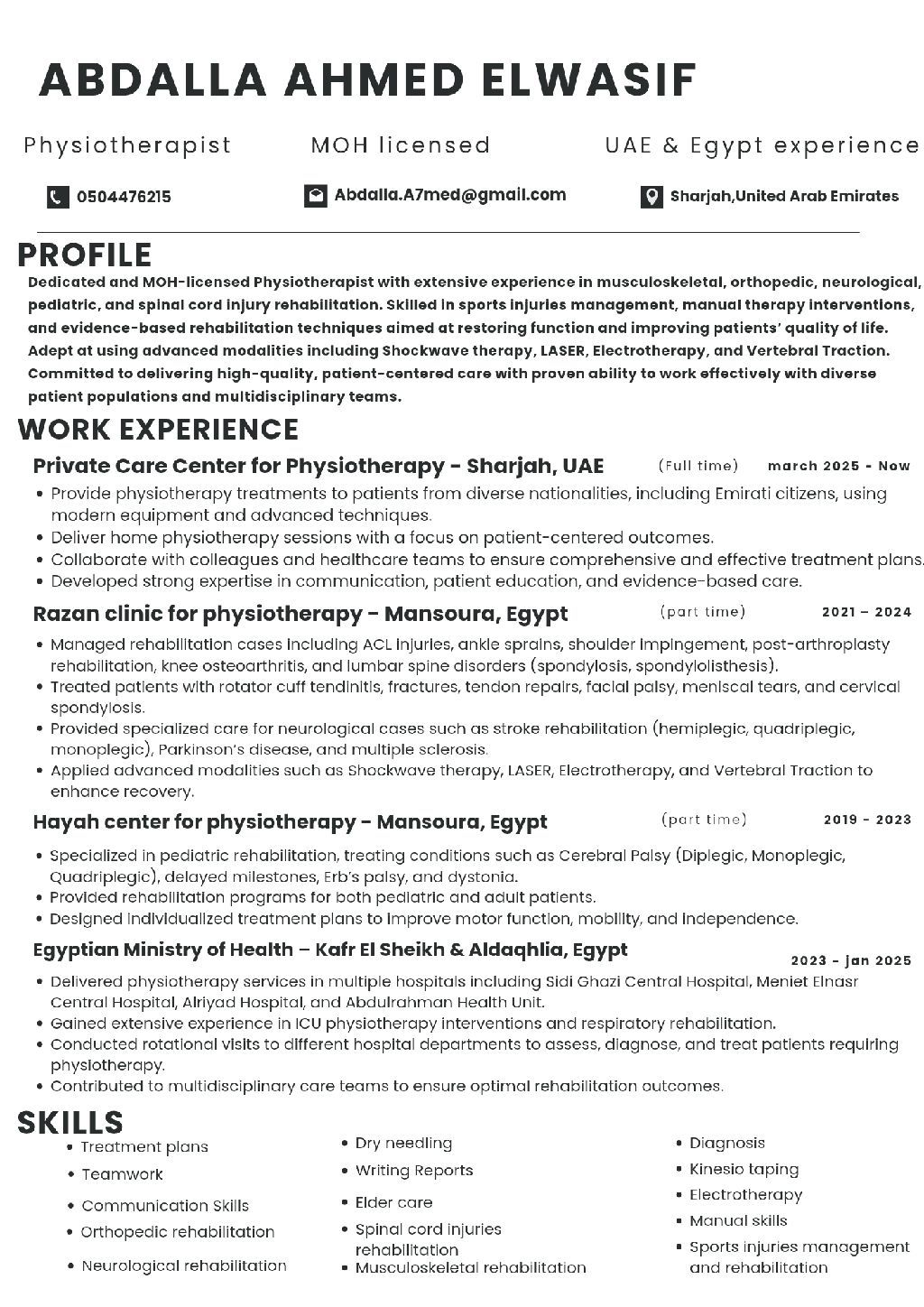 Expert Egyptian physiotherapist MOH, DOH, DHA licensed have strong experience inside UAE and Egypt experienced in orthopedic rehabilitation, neurological disorders rehabilitation, sports injuries rehabilitation and Musculoskeletal disorders rehabilitation. inside UAE now and ready to join