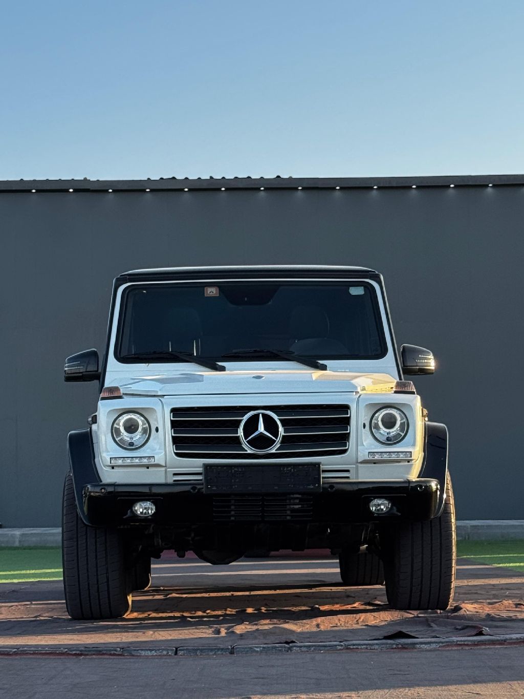 Mercedes G Class Edition 35 with Gulf specifications, 8-cylinder luxury and power vehicle ready for immediate financing. Features include touch screen, rear camera, front and rear sensors, navigation system, Bluetooth, electric seats with heating function, separate rear air conditioning, steering wheel controls, cruise control, smart key entry and start, sunroof. Financing options: Monthly installment of 6,060 AED with 20% down payment, or 7,580 AED monthly installment without down payment, including insurance, registration and all expenses. Representatives available at all banks.