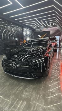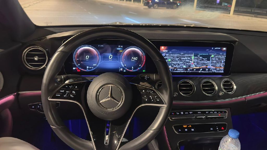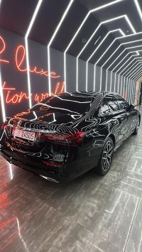 Mercedes E350 for sale, 2023 model, no accidents, black color with cosmetic paint only at the dealership. Mileage: 17,000 km, American specifications, 5 cameras, panoramic navigation, GCC navigation. Asking price: AED 155,000. Contact via WhatsApp preferred.