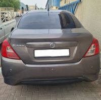 Nissan Sunny GCC model 2018, 4-cylinder, new wheel set, leather seat covers, new floor mats, just serviced in 2024 with oil change, oil filter, and air filter. Features include sensors, central locking, electric windows, automatic transmission, aluminum rims, Bluetooth, new battery, agency paint job, accident-free, one-year ownership, one-year insurance, air conditioning, refrigerator, fuel-efficient, fully serviced and ready to drive.