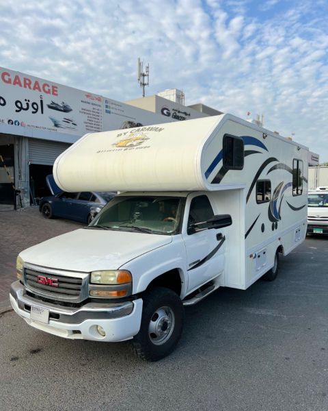 GMC 3500 RV vehicle, model year 2003. RV cabin length 5.5 meters. RV manufacturing year 2024. All appliances in the RV work excellently with no faults. Number and type of AC units: 2 AC units, 1 ton each. Generator type: petrol single phase - brand Sun Sea Chinese, size 6500 watts, silent generator. Sleeps 6 people. Overall condition of the RV is excellent. Price: 125,000 dirhams. Contact number available.