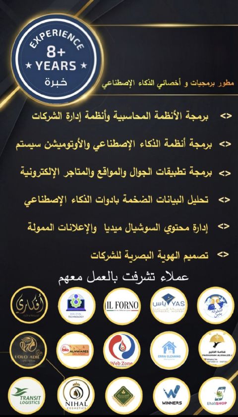 أنا مطور برمجيات ومتخصص في الذكاء الاصطناعي خبرة 8 سنوات داخل الامارات. لدي مجموعة من أنظمة الشركات الجاهزة مثل برامج المحاسبة وأنظمة إدارة شركات وأنظمة أخرى وأغلب هذه البرامج تعمل الآن في شركات. أحتاج الى ممول لاعادة بيع هذه البرامج عبر خطة تسويقية كبيرة ولا مانع لدي من تصميم برمج مقترحة وتنفيذها بجودة احترافية ليتم بيعها أيضا كل البرامج التي قمت بتصميم وبيعها موجود منها نسخة وجاهزة للتجربة