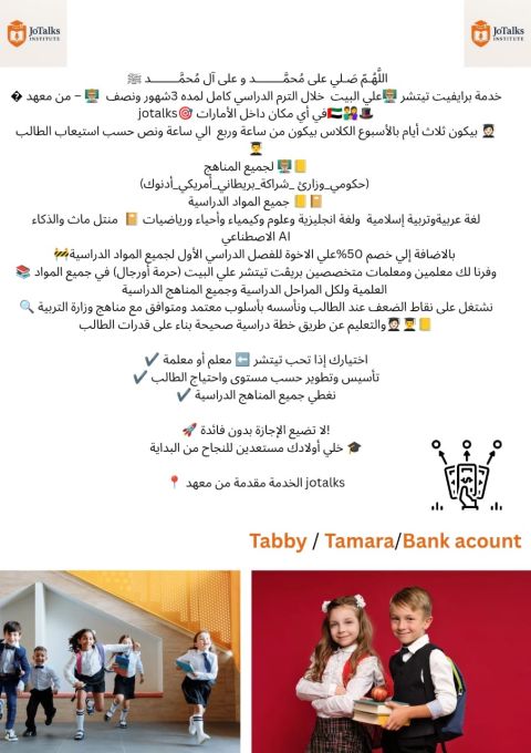 بكيدج المتابعة المدرسية - الفصل الدراسي الثاني ابدأ الفصل الدراسي الثاني بثقة وراحة بال انضم الى بكج المتابعة المدرسية المميز في المواد الدراسية بأكملها باشراف نخبة من المختصين والمعلمين ذوي الخبرة. مع حضور المدرس / ة الى البيت أو اونلاين العرض الخاص احجز الآن واحصل على فترة مراجعة مجانية أثناء اختبارات الفصل الدراسي الأول ماذا يشمل البكج متابعة أسبوعية منظمة لكل مادة واجبات وتقييم مستمر لقياس التقدم