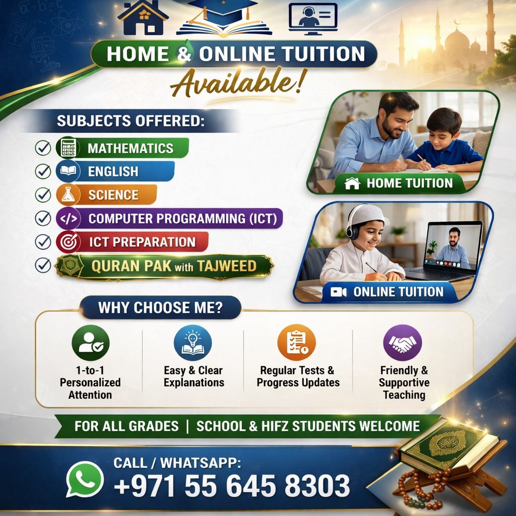 تعليم عالي الجودة، كل شيء في مكان واحد المواد المقدمة جميع المواد (الصفوف من 1 الى 10) التركيز بشكل خاص على العلوم واللغة الانجليزية والرياضيات برمجة الكمبيوتر (بايثون) حقائق قرآنية مع التجويد المناهج المغطاة المنهج البريطاني والأمريكي + المنهج الهندي والباكستاني لماذا تختارني أسلوب تدريس واضح وبسيط أساس قوي في العلوم واللغة الانجليزية