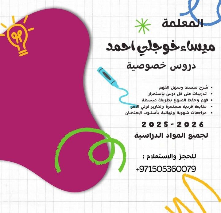 معكم مدرسة تخصص مادة اللغة العربية، معلمة خصوصية لتأسيس الطلاب خبرة سنوات في التدريس والتأسيس، تأسيس من الصفر لمعالجة جل الصعوبات للرقي بالطالب الى أبهى النتائج وتأسيسه على اكمل وجه، معالجة الضعف الاملائي وتأسيس في أساسيات القراءة والكتابة وسرعة الفهم، مع دراسة جميع المواد المدرسية (علوم، رياضيات، اجتماعيات، تربية اسلامية، لغة انجليزية)