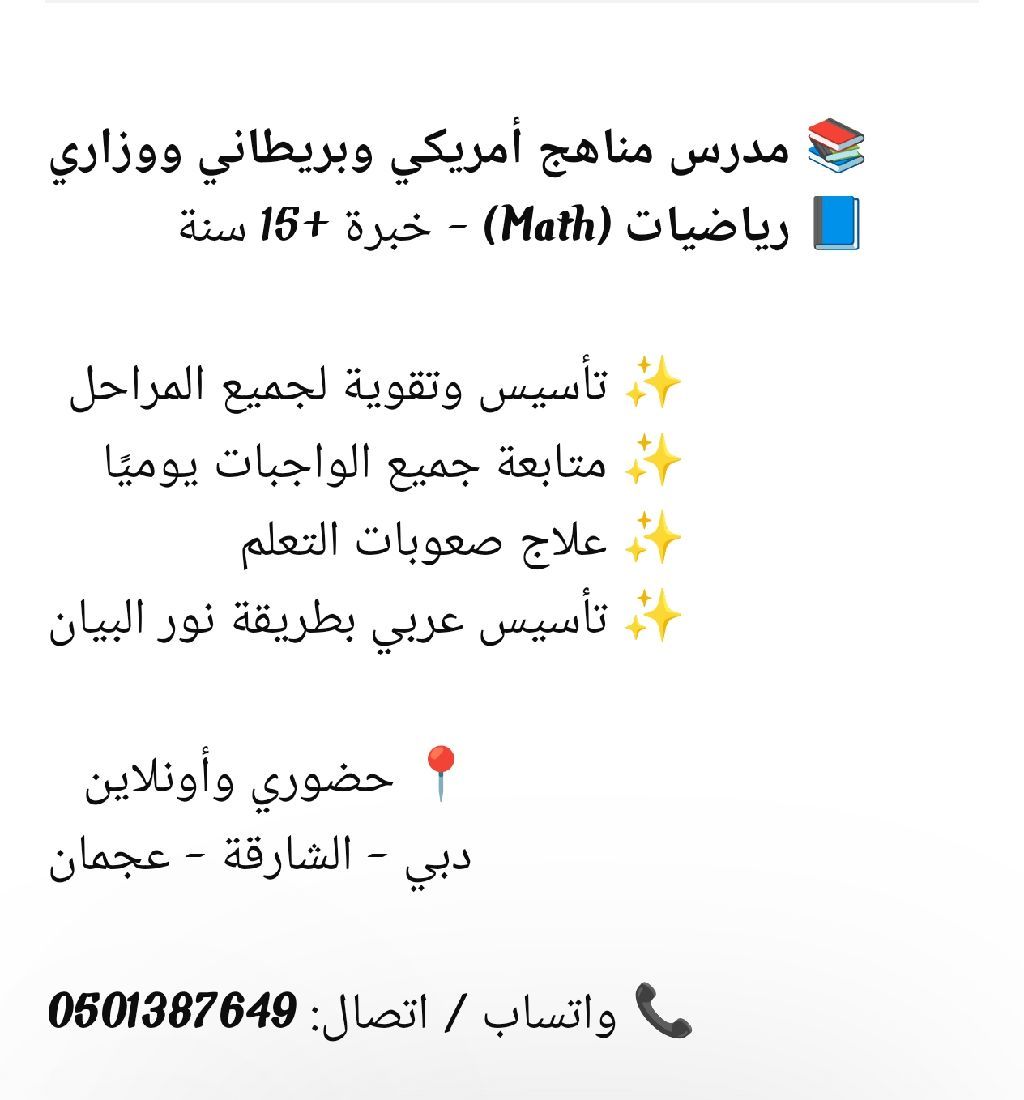 مدرس رياضيات منهاج أمريكي وبريطاني ووزاري خبرة + 15 سنة تأسيس وتقوية لجميع المراحل متابعة جميع الواجبات يوميا علاج صعوبات التعلم تأسيس عربي بطريقة نور البيان حضوري واونلاين دبي - الشارقة - عجمان واتساب / اتصال