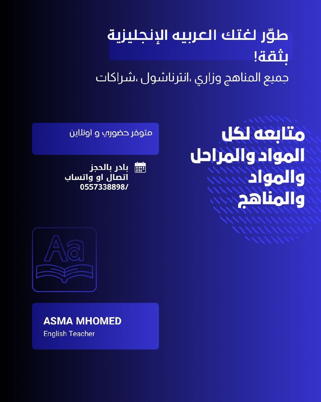 معلمه سودانيه ذات خبرة في تأسيس اللغة الانجليزية والعربية لكل المراحل بمختلف المناهج. وزاري، انترناشونال، شراكات بالاضافة الى المتابعة المدرسية للعلوم وغيرها من المواد ومساعدة الطلاب علي حل الواجبات في المنصات. متوفر حضوري واونلاين. للتواصل اتصال أو واتساب على الرقم