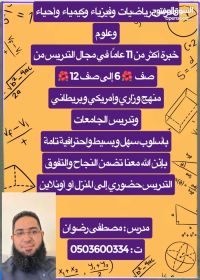 مدرس رياضيات وفيزياء خبرة أكثر من 11 عاما في مجال التدريس من صف 6 الى صف 12 منهج وزاري وأمريكي وبريطاني وتدريس الجامعات بأسلوب سهل وبسيط واحترافية تامة معنا تضمن النجاح والتفوق التدريس حضوري دبي والشارقة وعجمان وأم القيوين. حضوري أو اونلاين