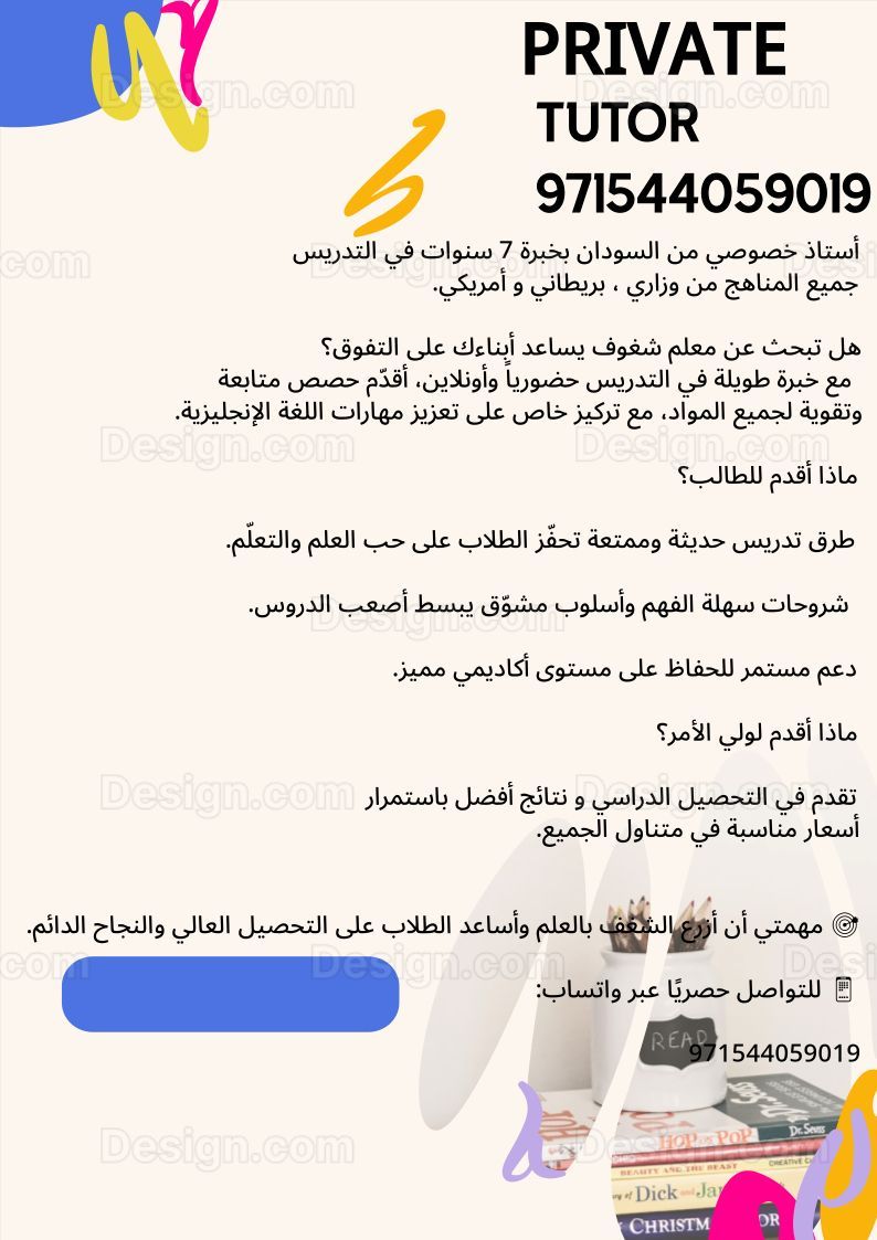 Private lessons with reasonable prices. An experienced Sudanese teacher with over seven years in teaching. Face to face private lessons at your home. Guaranteed results, continuous checking, all subjects taken care of. You won't regret Contact on WhatsApp for further inquiries