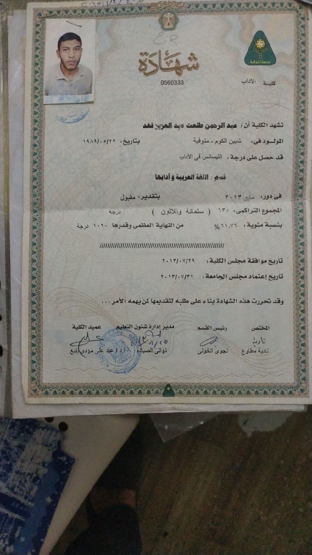 Full Name Abdelrahman Talaat Abdelaziz Fahd Date of Birth 22/ 5/ 1989 Address Menoufia, Shebin El - Kom, Egypt Marital Status Married Phone Education Bachelor of Arts in Arabic Language. Professional Experience 1. Al Amal Private School - Shebin El - Kom Duration 1.5 years Responsibilities Teaching Arabic language across all grade levels - Quran memorization with Tajweed - Tea